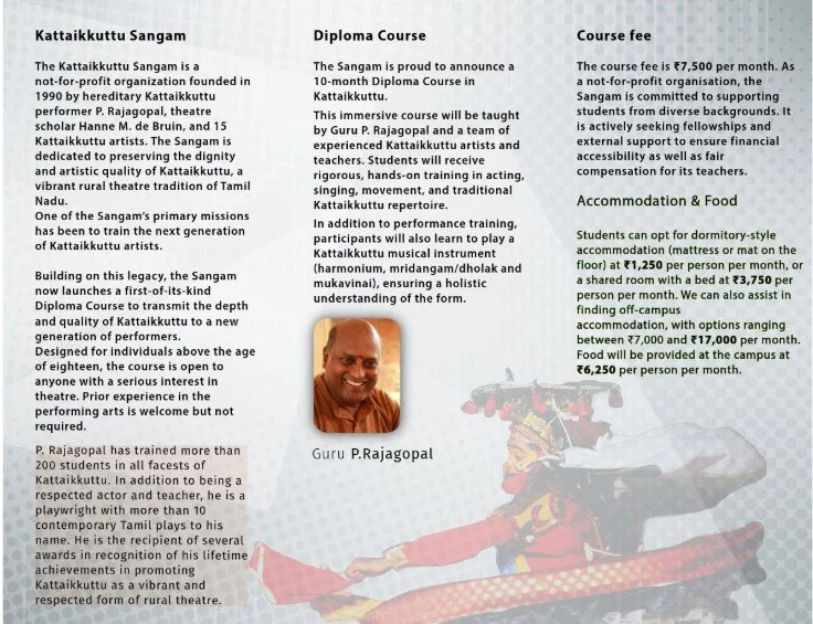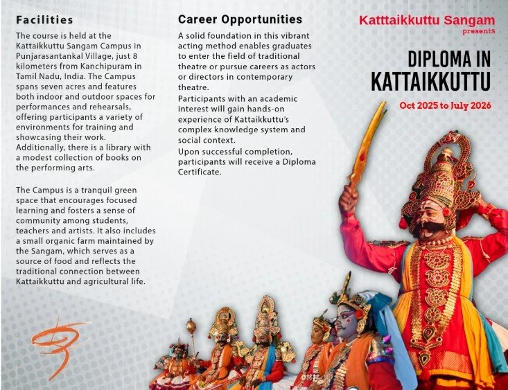 The Sangam offers a first-of-its-kind Diploma Course in Kattaikkuttu, also known as Therukoothu, one of India’s traditional theatre forms. This 10-month program provides hands-on training in acting, singing, movement, and Kattaikkuttu’s repertoire under the guidance of Guru P. Rajagopal and experienced teachers. Participants will also learn to play a musical instrument (harmonium, mridangam/dholak, mukavinai). Upon successful completion, graduates will receive a diploma and be well-prepared for roles in Kattaikkuttu theatre or contemporary theatre and film.