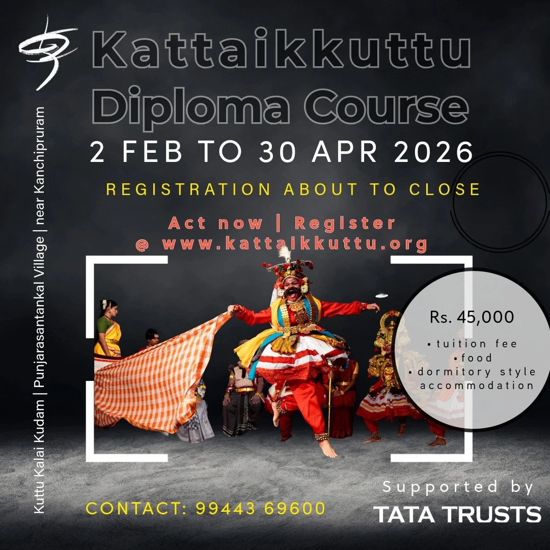 Open to individuals over 18, the course has a limited enrolment of 20 to 25 participants. While prior experience in the performing arts is welcome, it is not a requirement. The training takes place at the Kattaikkuttu Sangam in Punjarasantankal, located 8 km outside Kanchipuram. Registration is still open for 1 February to 30 April 2026 segment of the Course. Interested persons can register here.